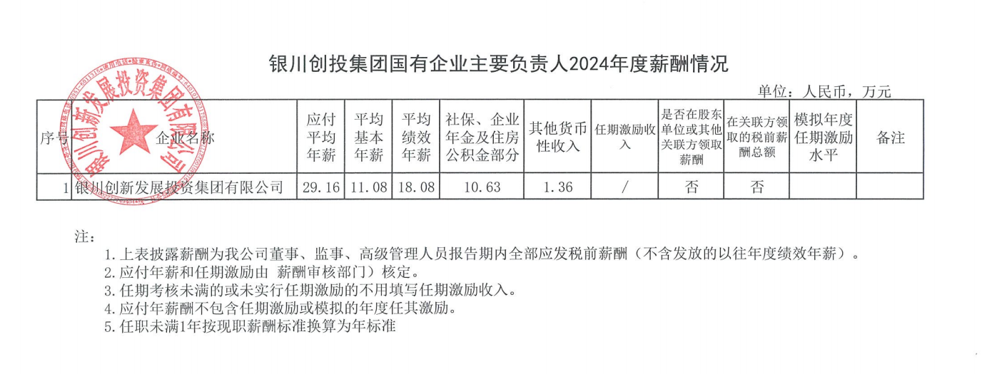 銀川創(chuàng)投集團(tuán)國有企業(yè)主要負(fù)責(zé)人2024年度薪酬情況